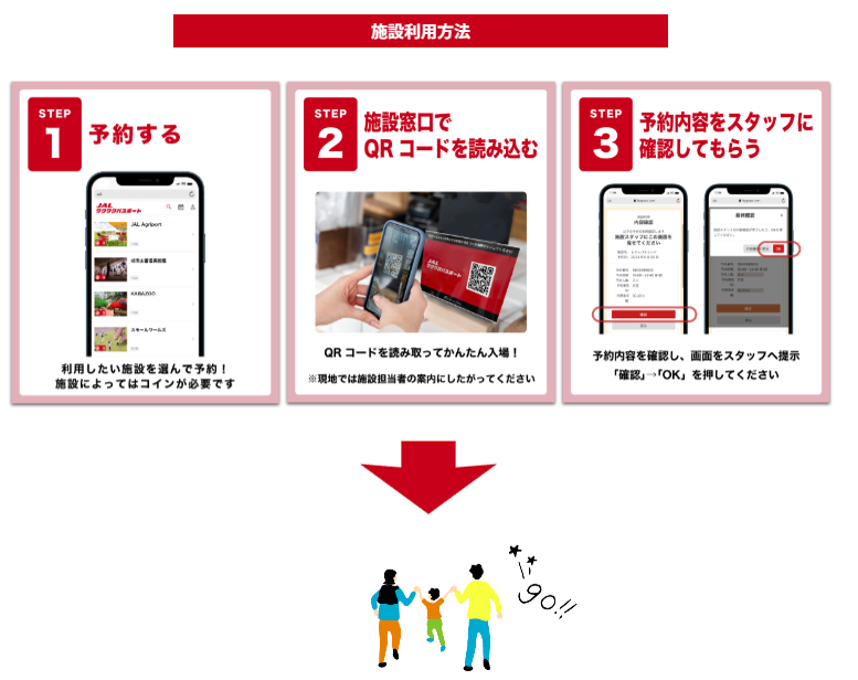 JALワクワクパスポートにログインのうえ、受付に設置されたQRコードをお客さまご自身のスマートフォンで読み取っていただき、表示されたチェックイン画面をスタッフにご提示ください。